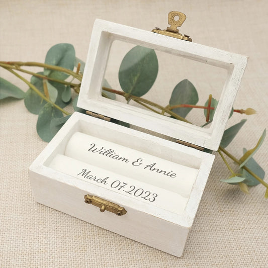 Wedding ring boxes are elegant containers designed to hold and present the couple's wedding rings during the ceremony and beyond. Typically crafted from materials such as wood, velvet, or metal, these boxes come in a variety of styles, from classic to modern, to complement the couple's aesthetic. Many feature padded interiors to securely cradle the rings, while others may have personalized engravings or custom designs that reflect the couple's love story. Beyond their functional purpose, wedding ring boxes often serve as keepsakes, symbolizing the commitment and memories shared on that special day.